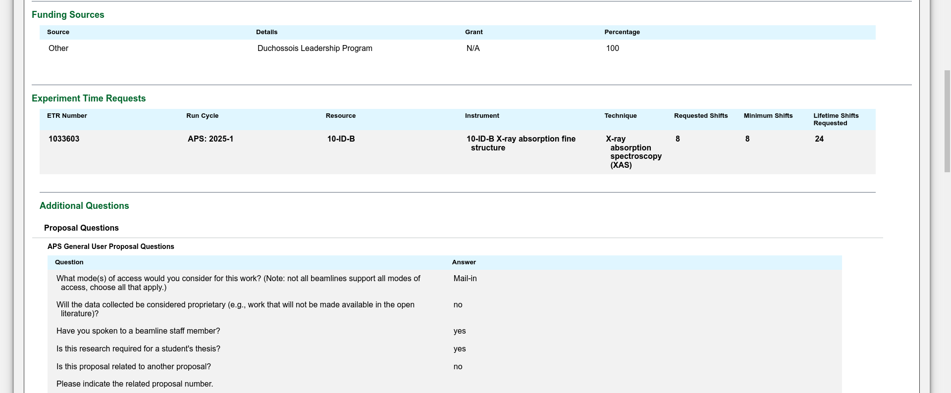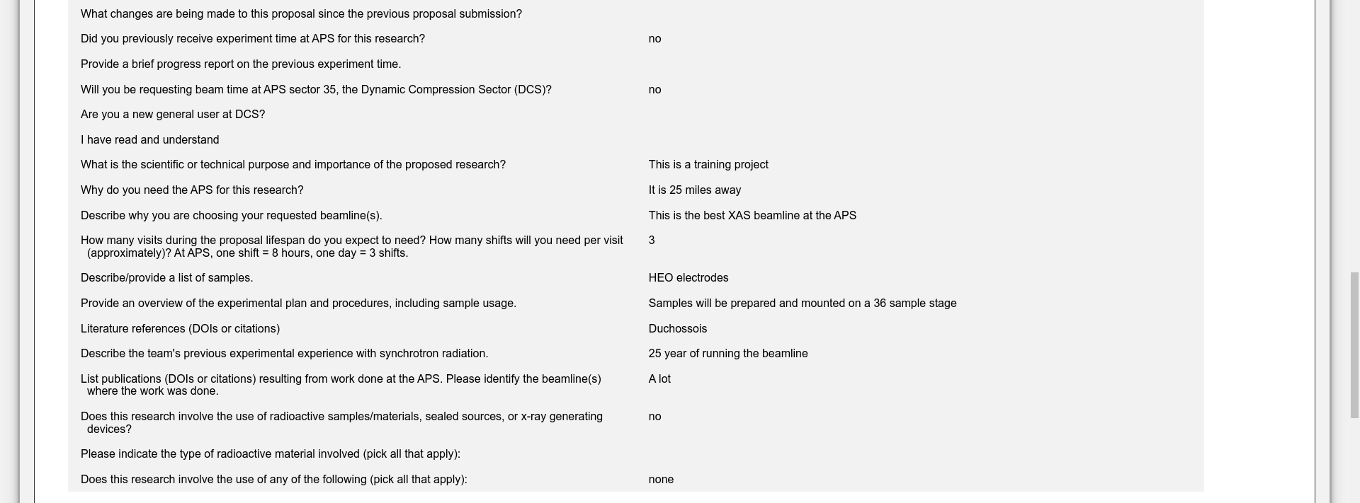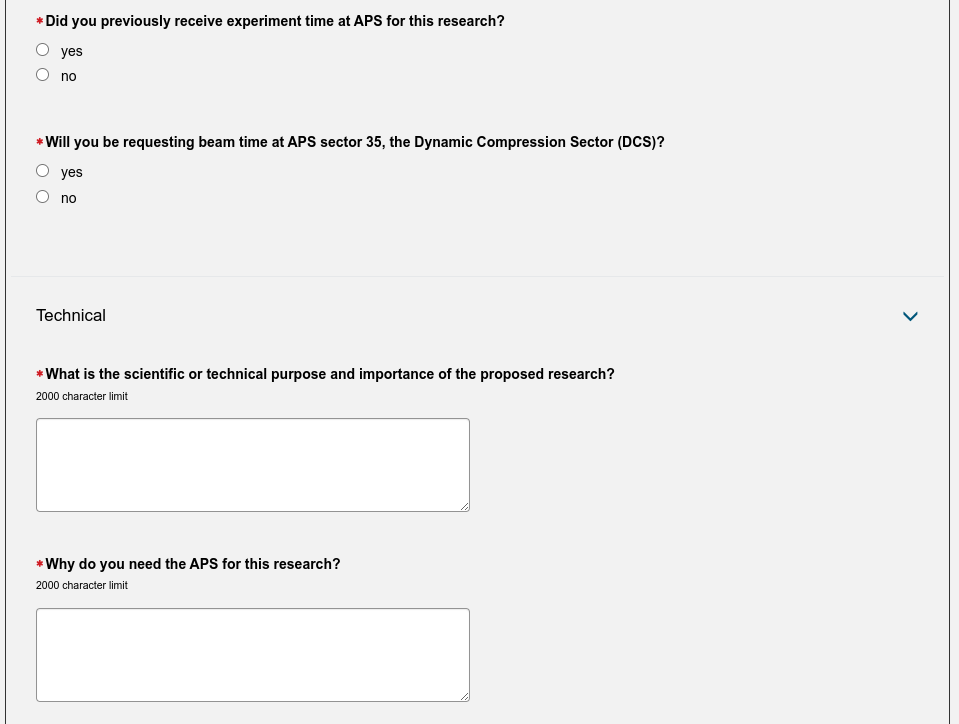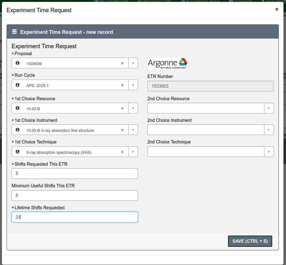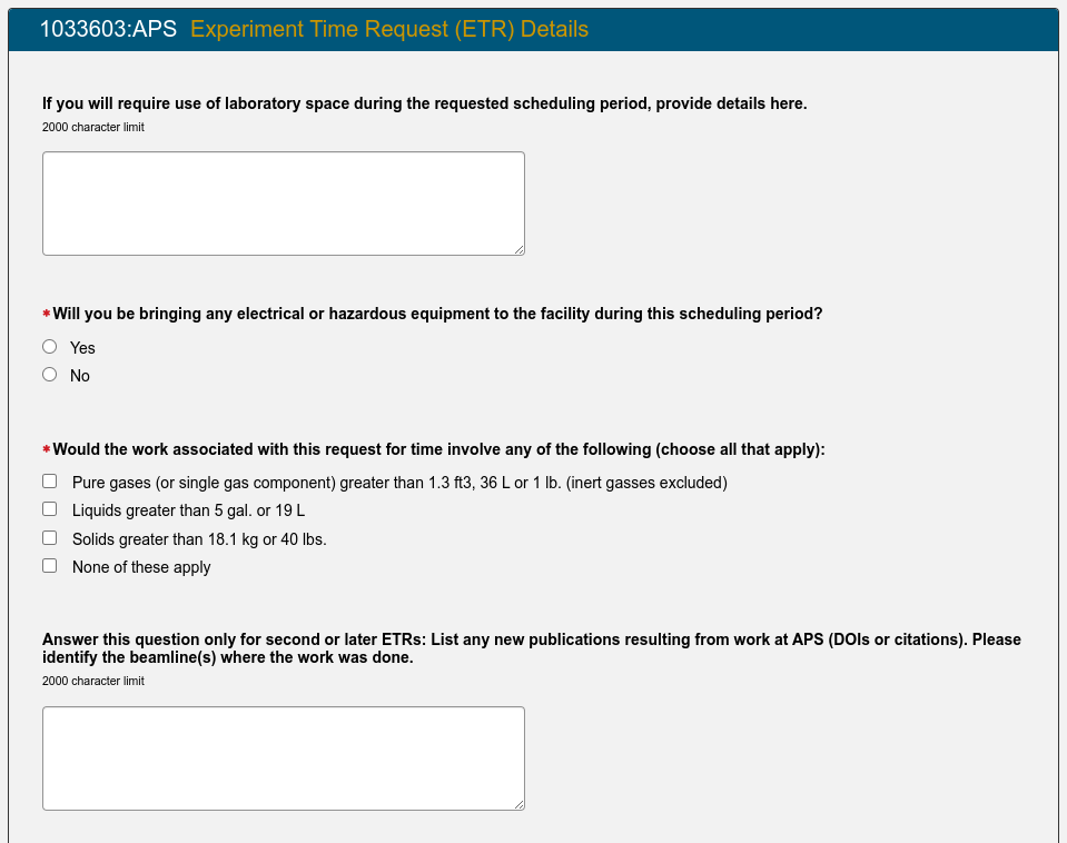 Fill out one or more Experiment Time Requests (ETRs). The Experiment Time Request is the trickiest part of the proposal. You need to make a separate ETR for each different beamline you need to carry out your experiment. Insert the total number of shifts you are requesting for the duration of the experiment (you might want to come to the APS more than once) but you will have to justify this later in the proposal so ask for a reasonable amount for the experiment you are interested in carrying out. Then select the beamlines which are suitable for your experiment. You need to consult the Beamlines Directory to figure out which beamlines are suitable for your experiment. There may be multiple instruments available on each beamline so you may also need to select the instrument. If you have any specialized equipment you are bringing to the beamline, add this too and make a request for the number of shifts that you want during the upcoming run (this is not the total that you inserted above if you plan to come more than once).