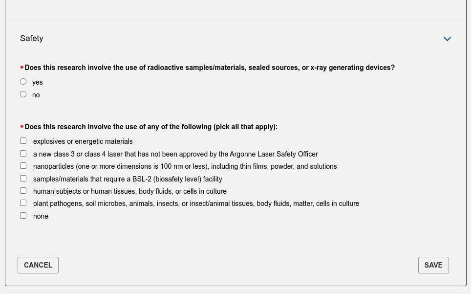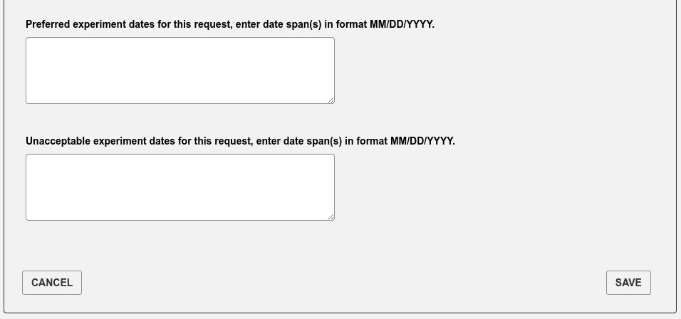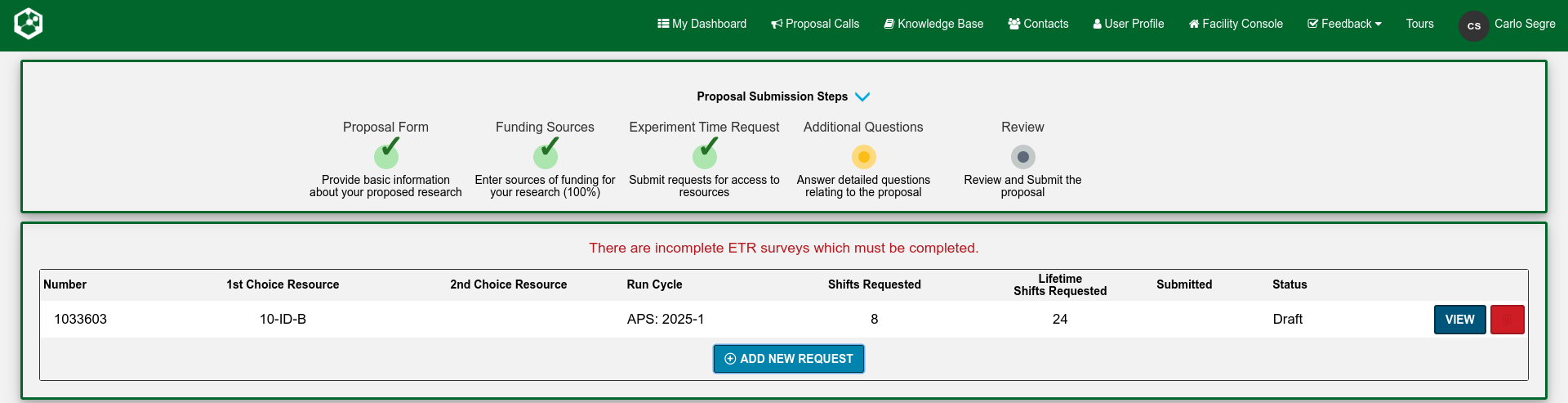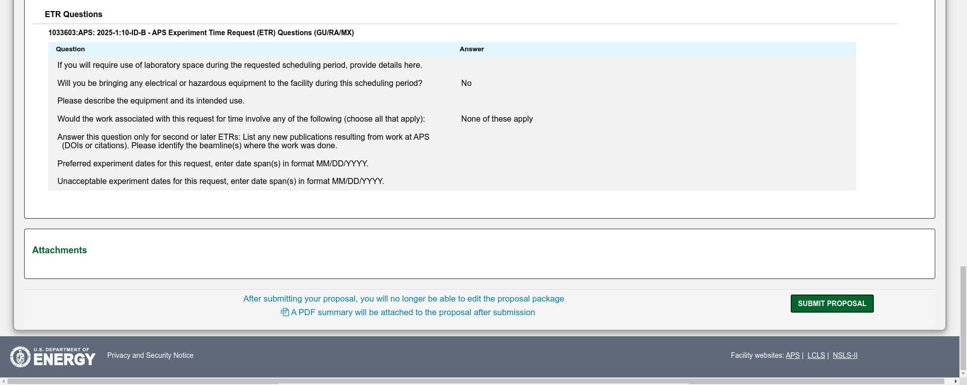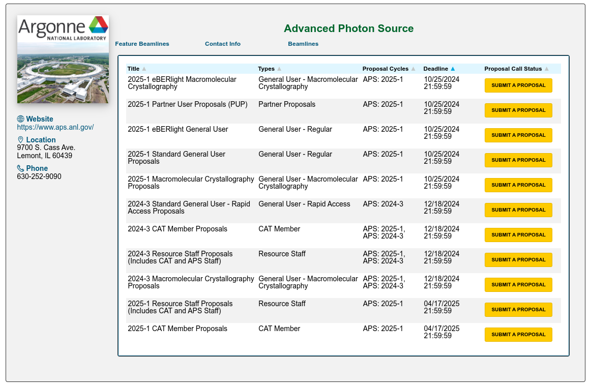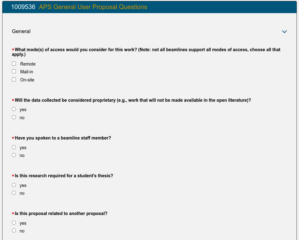 Fill out one or more Experiment Time Requests (ETRs). The Experiment Time Request is the trickiest part of the proposal. You need to make a separate ETR for each different beamline you need to carry out your experiment. Insert the total number of shifts you are requesting for the duration of the experiment (you might want to come to the APS more than once) but you will have to justify this later in the proposal so ask for a reasonable amount for the experiment you are interested in carrying out. Then select the beamlines which are suitable for your experiment. You need to consult the Beamlines Directory to figure out which beamlines are suitable for your experiment. There may be multiple instruments available on each beamline so you may also need to select the instrument. If you have any specialized equipment you are bringing to the beamline, add this too and make a request for the number of shifts that you want during the upcoming run (this is not the total that you inserted above if you plan to come more than once).