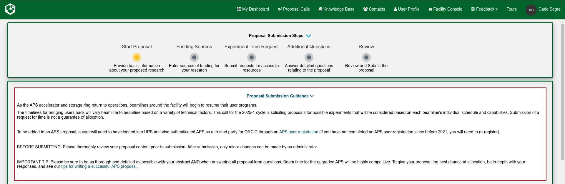 Once you have registered with the APS, you may begin a GU proposal. You will see the screen shown below.