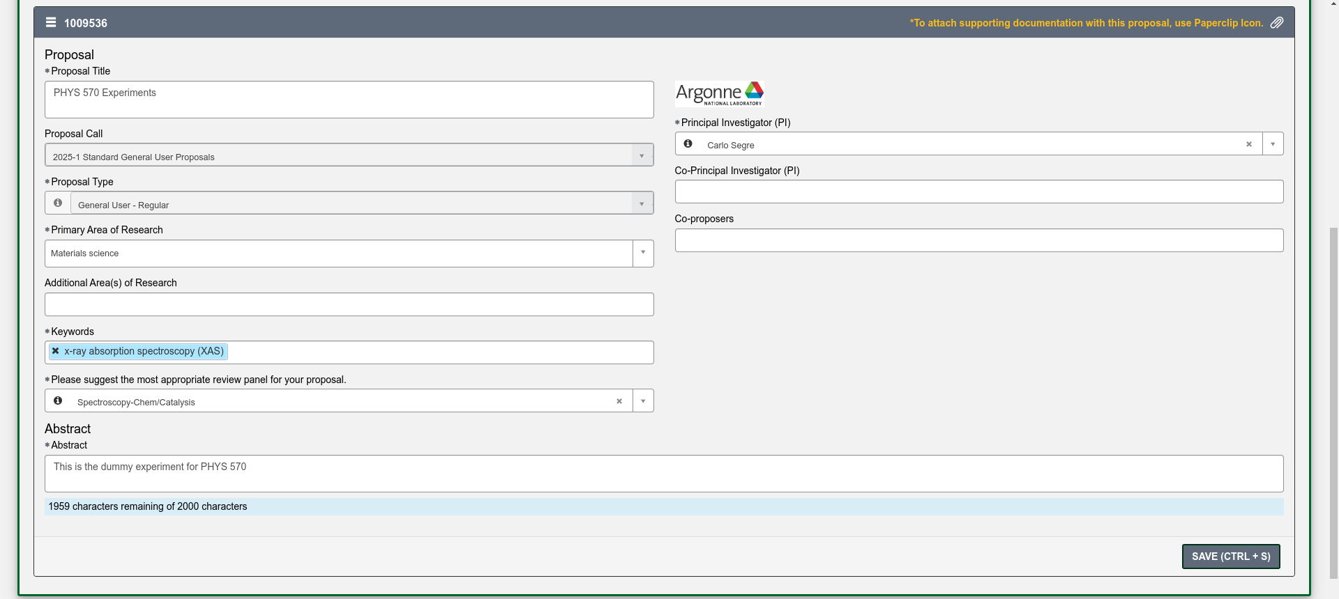 You will now have to fill in a proposal title, abstract and basic information about the proposal. You can also add additional PIs and experimenters. Please add me as one of the experimenters so I can see the proposal in the system. Make sure to save the proposal with the button at the bottom of the page. You also need to choose the panel which will review your proposal. This is usually dependent on technique.